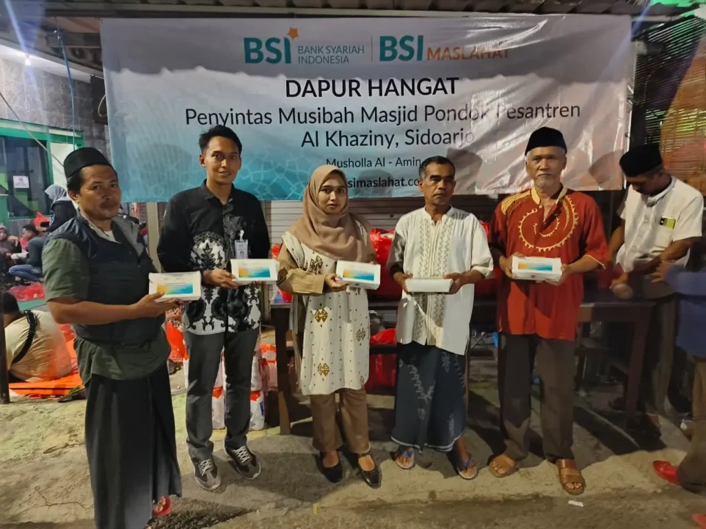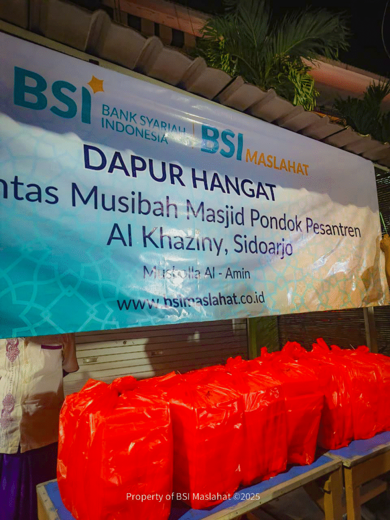 Sebagai bentuk kepedulian terhadap para korban dan keluarga yang terdampak, BSI Maslahat menyalurkan bantuan kemanusiaan senilai Rp150Juta kepada pihak Ponpes Al Khoziny. Dana tersebut digunakan mendukung proses pemulihan pasca tragedi dan penyediaan Dapur Hangat di sekitar lokasi kejadian. Dapur hangat ini menyediakan makanan dan minuman hangat bagi keluarga terdampak dan para relawan yang terlibat dalam proses evakuasi. Baca juga : BSI Maslahat Dukung Pertumbuhan Ekonomi Syariah Lewat Kemandirian Ekonomi Pesantren