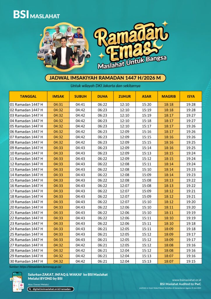 BSI Maslahat menghadirkan Jadwal Imsakiyah 1447 Hijriah sebagai panduan waktu ibadah bagi Sahabat Maslahat di DKI Jakarta dan sekitarnya. Penyajian jadwal ini menjadi bagian dari komitmen BSI Maslahat dalam mendukung kelancaran ibadah Ramadan melalui informasi waktu salat, imsak, dan buka puasa yang akurat.